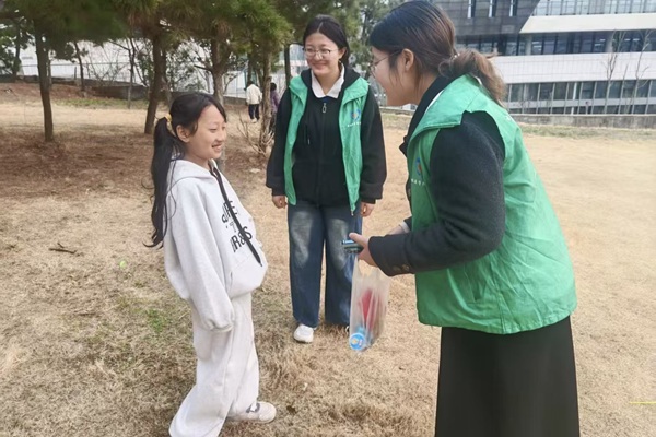 活动伊始,孔宇航组织团支部成员兵分两路开展活动。一部分团支部成员们两两一组,沿公园步道有序开展“净园”活动,大家分工协作,一人专门负责手提垃圾袋敞开承接,另一人手持垃圾夹仔细捡拾草丛、路边的纸屑、塑料瓶、烟头等垃圾,成员们耐心俯身,仔细搜寻每一个卫生死角。特别是对步道旁易被儿童踩到的尖锐木签,成员们格外留意,逐一夹起并做好处理,以细致的行动消除安全隐患,用实际汗水为公园“美颜”。与此同时,另一部分团支部成员化身“反诈小卫士”,在公园内以“反诈趣味问答”的形式吸引小朋友们积极参与,小朋友回答成功,便可获得精心准备的糖果作为奖励,获得糖果的小朋友兴致更高,成员们趁热打铁,通过情景模拟重现“游戏皮肤免费领”的骗局,并用通俗易懂的语言生动讲解“冒充熟人借钱”等常见的诈骗手段。成员们耐心细致的讲解,让小朋友们在轻松的氛围中收获了实用的安全知识。