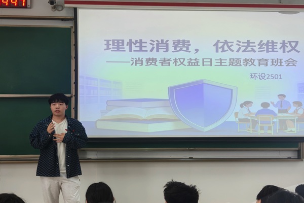 结合消费者权益日,学院深入开展消费维权与学风融合教育,通过案例剖析、法规解读、维权实训、学业引导等多种形式,引导学生树立理性消费观念、增强依法维权意识,同时将法治教育与学风建设紧密结合,实现“以法促学、以学固本”的育人目标。电气2504班召开“理性消费,依法维权”主题班会,通过剖析“校园贷”、网络购物虚假宣传等典型案例,系统讲解《消费者权益保护法》核心权利及六种维权方式,有效增强了学生的消费风险识别与自我保护能力。环设2501班则召开“树立理性消费观念,筑牢优良学风根基”主题教育班会,将理性消费引导与学风建设紧密结合。班长针对学生群体中盲目攀比、超前消费等现象,结合真实案例剖析非理性消费的弊端,解读消费者权益保护相关法规,并介绍具体的维权渠道与方法。
