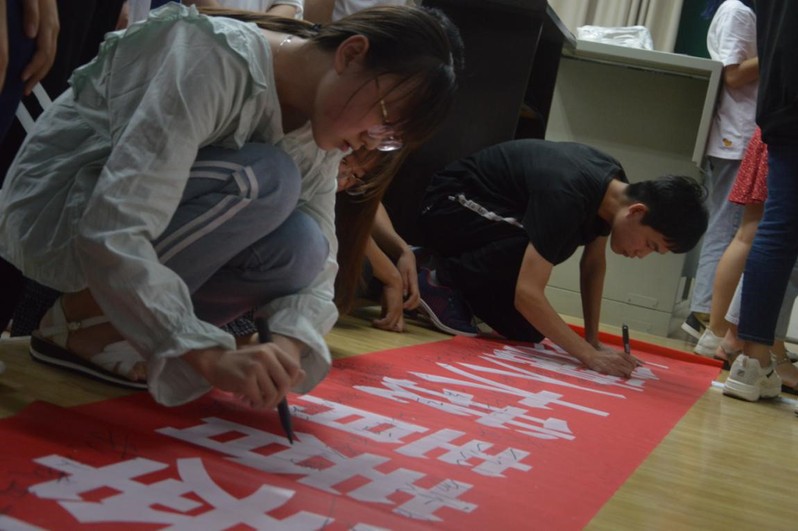 9月26日晚,活动伊始,本次的主持人崔静带领同学们重温70年前的开国大典,视频是由俄国摄影师用彩色胶卷拍摄,将俄语专业的魅力完美地展现出来。接下来,活动围绕“社会实践和当代大学生责任与担当”这一话题,邀请到了来自中国石油大学南衫支教队、Dream-Seeker实践队及薪火相传实践队的三名队员,由他们依次讲述活动经历并与在座同学们交流了感受。正如主持人所说:“一个有责任有担当的社会主义青年,就应该把青春奉献给祖国,把汗水洒遍大地”。然后,各个团支部的成员以小组的形式积极踊跃地分享了自己的实践趣事,总结自己在活动中遇到的问题。交流过后,参加活动的各位同学在主持人的带领下,全体起立并庄严宣誓,所有人举右手、握紧拳,喊出了青春献给祖国的心愿,宛如入党誓词的宣读,饱含着青年人对祖国的热爱。过后,三个支部的同学集体在条幅上写下了对祖国的寄语并在黑板上画出了对祖国的祝福,以抒发“小我融入大我”的爱国之情。