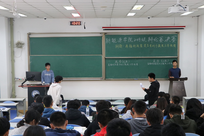 本次辩论赛分为初赛,半决赛,决赛共七场举办。参赛队伍分别围绕宽松式管理是否有利于大学生学习、网络对大学生的利或弊、高福利政策是否有利于激励工作热情等社会热点辩题展开激烈辩论。本次辩论赛采用常规辩论赛赛制,但在其中添加了观众提问的环节。首先进行一辩立论,其对整个赛程起了决定性作用;接下来二三辩攻辩,在攻辩环节中各队伍的二三辩选手唇枪舌战,互不相让;最后添加的观众提问环节让整场辩论锦上添花,观众的思维方式也会让队员们耳目一新。在最终决赛中,由电气工程及其自动化三班、四班组成的八队与能源与动力工程一班、二班组成的三队进行辩论,在本场辩论中,电气三班的马永龙同学这么说:“高福利待遇是很好没错,可以让员工感觉到更暖心,但是别忘了,长久以往,这样下去,高福利待遇带来的不是更高的工作热情,而是更大的危机。”马永龙同学的发言为其队伍后续的攻辩环节奠定了基础,为其获得最终的冠军提供了有力保障。
