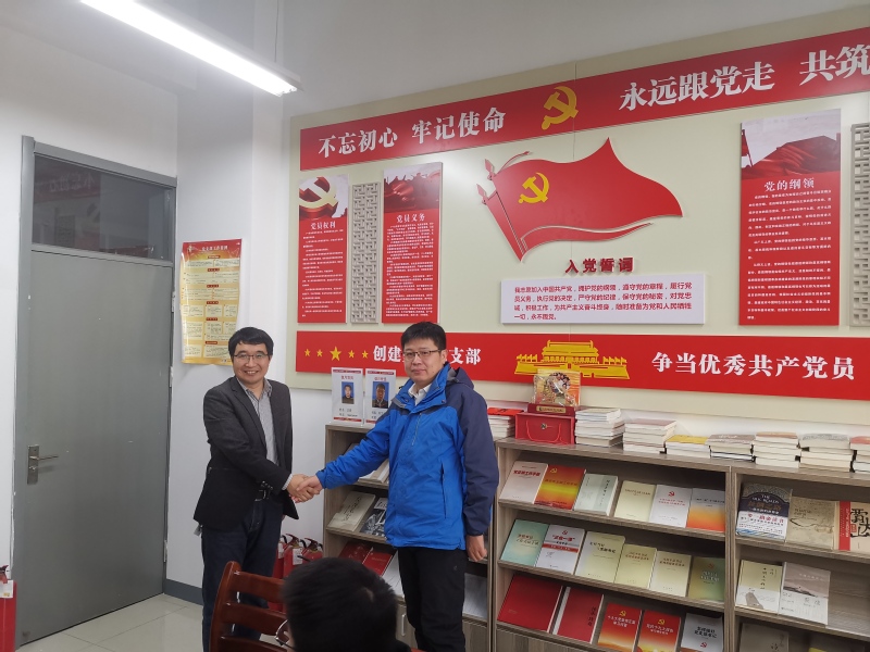 最后,本月值月党员王君和下月的值月党员刘文强进行了交接。