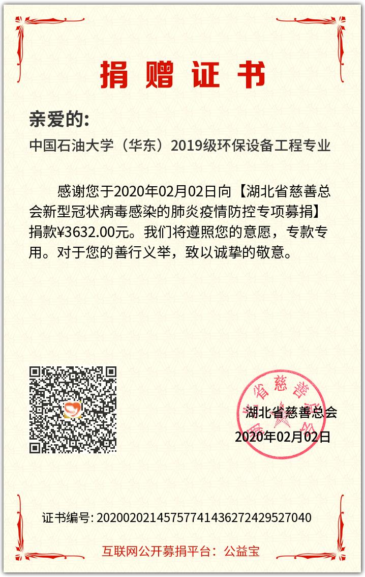 为向当前武汉疫情防控工作贡献力量、提供帮助,我院环保设备工程专业2019级学生自主发起了集体捐款活动,为抗疫前线蓄力,为武汉加油。