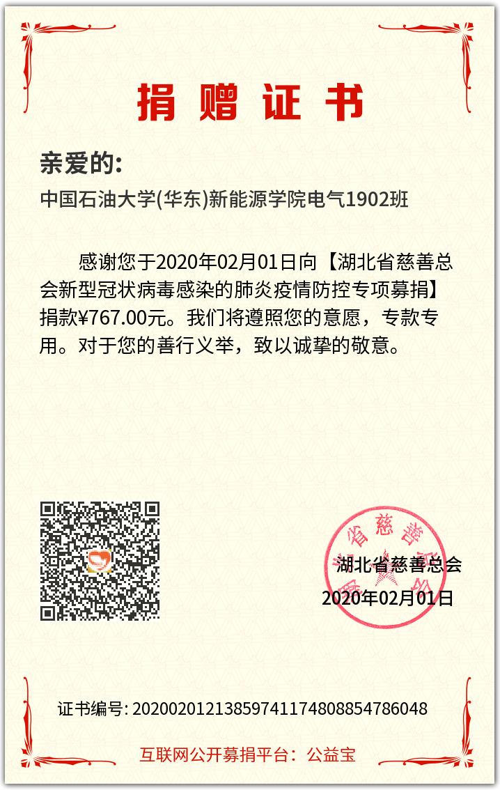 为争取早日控制肺炎疫情,2月1日,我院电气工程及其自动化1902班向湖北省慈善总会新型冠状病毒感染的肺炎疫情防控专项募集了767 元,用于新型冠状病毒防治,湖北省慈善总会颁发电子证书以致敬意。