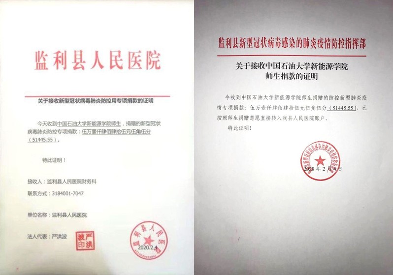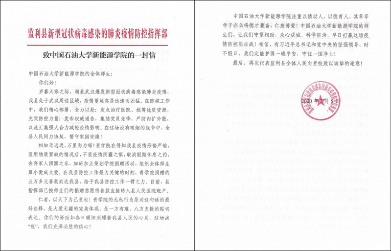 监利县人民医院是湖北省荆州市的防疫定点医院,疫情爆发期间,荆州市疫情严重,医院医疗物资紧缺。yl88858永利中国学生党总支通过湖北籍学生了解到此情况后,2月3日在全院学生中发起倡议、筹集善款,为监利县人民医院进行定点捐赠,一天之内,共筹集款项51445.55元,其中学生党支部捐款18270.96元,各团支部捐款29526.59元,学生会捐款848元,学工队伍教师捐款2800元。监利县新型疫情肺炎防控指挥部在感谢信中提到:“自从武汉爆发新型冠状病毒感染肺炎疫情以来,我县疫情形势日益严峻,医用资源紧缺。石大yl88858永利中国得知此情况后,对疫情毫不畏惧,策划捐赠活动,组织动员学院师生献来爱心,在我县疫情防控的紧张时刻,学院送来的捐赠给予我县疫情防控工作以强大动力。”此外,感谢信特别指出,此次捐赠活动是中国石油大学师生大爱无疆品格的完美体现,是一方有难、八方支援的贴切表达,充分体现了石大注重以情动人、以德育人的教育理念,监利县将及时向学院师生通报本次捐赠款使用明细,同时也将本次捐赠作为一次德育和感恩教育活动在全县宣传。