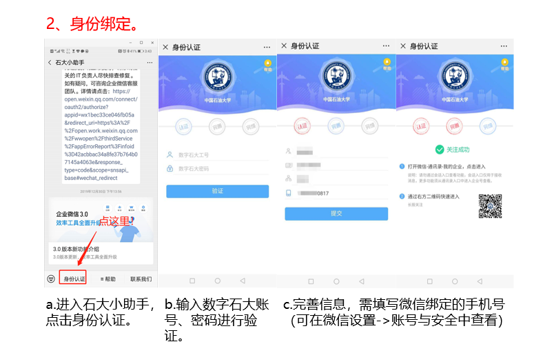 1.关于身份绑定:关注yl8858永利集团微信企业号后需进行身份绑定。如已经绑定请核查绑定信息是否正确,若非当前正确信息,进入公众号,搜索石大小助手,从下方的身份验证栏进入个人中心,解绑微信号并退出登录,重新进行正确身份验证。