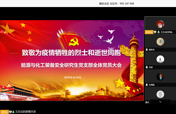 为悼念为疫情牺牲的烈士和逝世同胞,能源与化工装备安全研究生党支部在4月4日上午十点利用网络线上电话会议的形式召开悼念默哀活动。会议主要是进行默哀活动并讲述学习英烈们的故事,捍卫英雄,学习英雄,关爱英雄,铭记革命先烈的光荣事迹增强使命感和爱国情怀。会议由党支部书记王乐佳主持,25名党员参与此次会议。