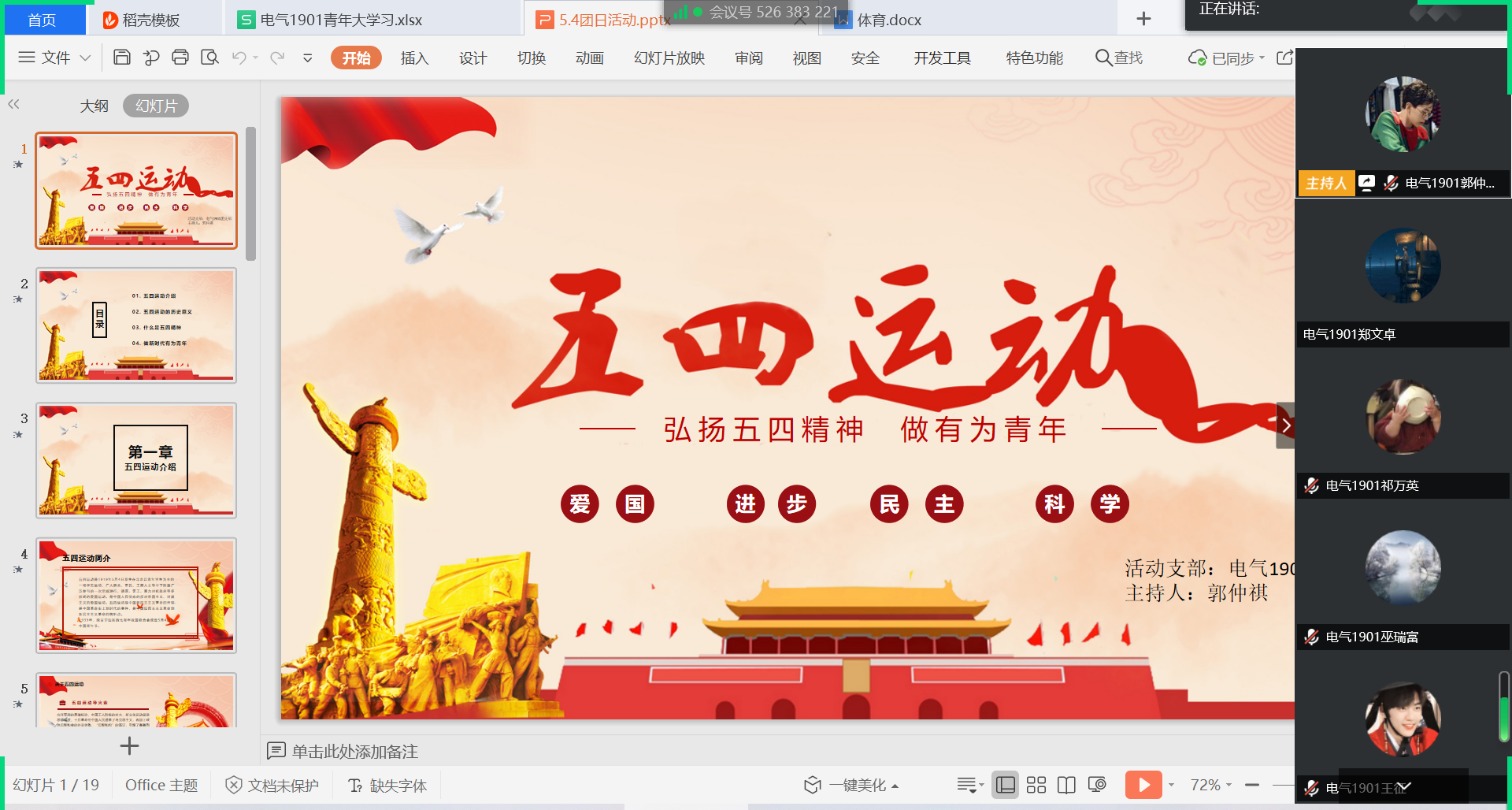 我院电气工程及其自动化专业1901班于5月4日开展主题为“弘扬五四精神,争做有为青年”的团日活动。受疫情影响,本次活动于“腾讯会议”线上平台进行。