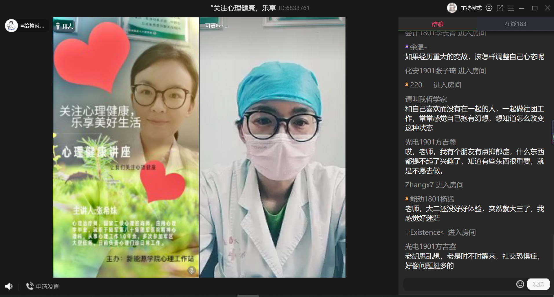 为加强心理健康教育工作,增进学生之间的交流,保证大学生居家学习期间的心理健康,我院心理健康工作站于5.25大学生心理健康日开展“关注心理健康·乐享美好生活”的专题心理讲座。本次讲座邀请到就职于陆军第八十集团军医院精神心理科,从事心理工作10余年,擅长青少年心理问题咨询、轻、中、重度抑郁及焦虑情绪的心理治疗、心理危机干预、团体心理行为训练等多项工作的专业心理理疗师张希妹作为主讲人进行心理讲座以及为参会学生答疑解惑。
