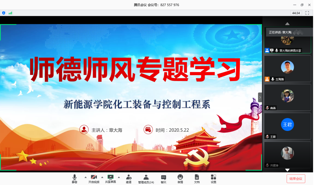 5月22日下午,装控系开展师德师风专题学习活动,活动通过腾讯会议线上召开,支部书记左海强主持本次活动,装控系全体教师通过会议客户端远程参加。左海强首先传达了学校关于疫情防控的有关要求,强调当前情况下要不断提高政治站位,全力做好疫情期间教职工日常管理与防护,确保师生生命安全和身心健康,同时保障教学、科研等各项工作平稳有序开展。接下来,按照学校关于加强师德师风建设的部署,在前期教师个人线下自学的基础上,本次开展师德师风专题线上集中学习,学习活动由本月值月党员章大海老师主讲,内容包括习近平寄语教师箴言、国家师德师风规定、学校师德师风规定和学校师德师风要求等,最后以“学生一句肖战必糊,竟招老师怒骂滚出去”这一网络热点事件作为案例进行集体讨论,探讨如何在教学活动中,尤其是网络授课环境下进一步提升教师思想政治素质和职业道德水平。通过本次学习活动,全体教师进一步深入了解了师德师风的有关要求,表示在工作中将率先垂范以德立身、以德立学、以德施教。