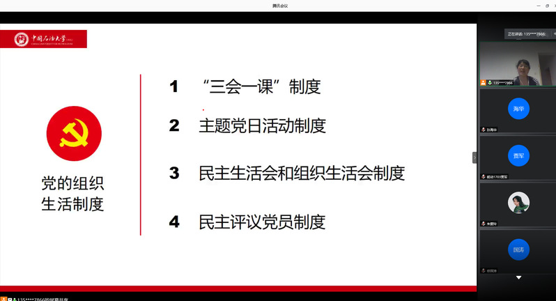 首先,能动党支部书记张克舫从“三会一课”制度、“主题党日活动”制度、“民主生活会和组织生活会”制度、“民主评议党员”制度四个方面对党的组织生活制度展开详细介绍,她强调:“组织生活会在党的组织生活制度中扮演者十分重要的角色,支部成员在组织生活会中认真开展自我批评与相互批评,有助于及时认清自己的不足,实现共同进步,同时对加强党支部的自身建设具有重要意义。”