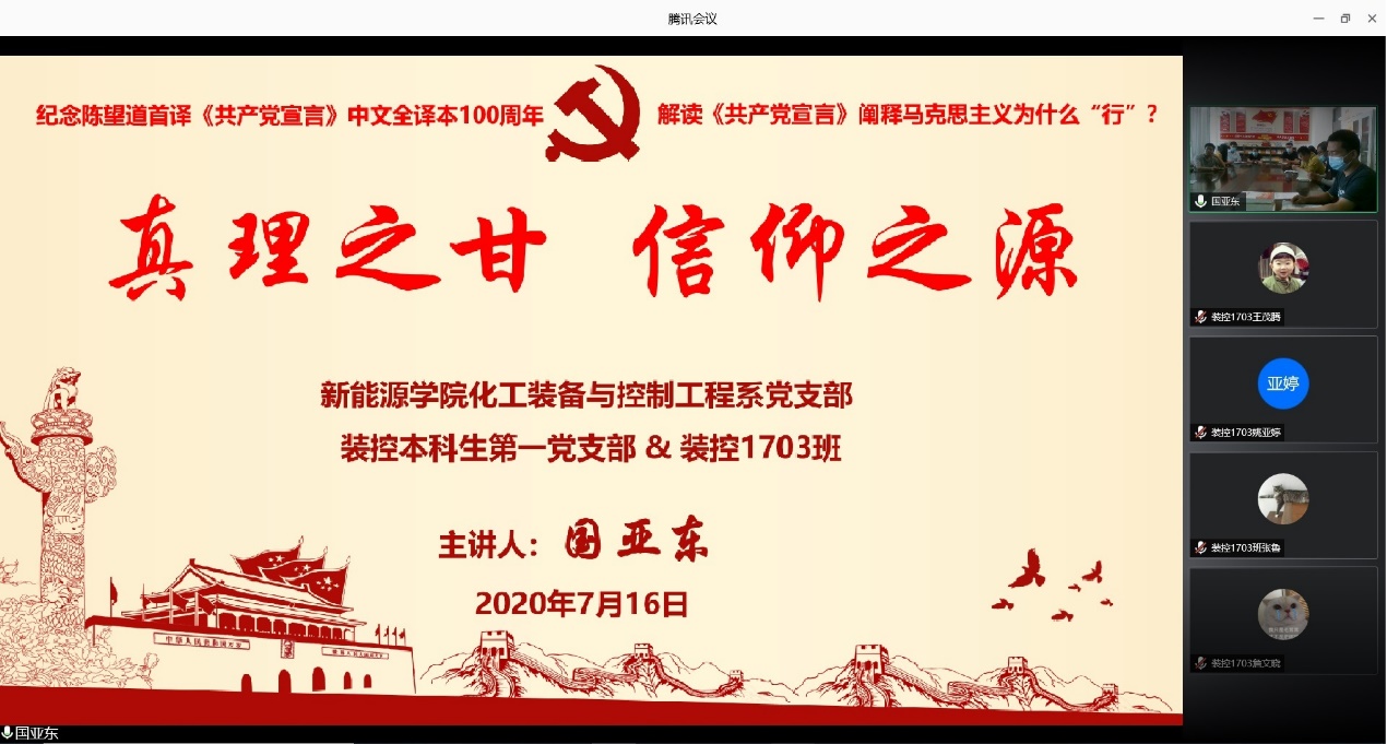 7月16日下午,装控系教工党支部、装控本科生第一党支部和装控1703班联合开展学习教育活动,活动采用线下、线上联合开展,装控系部分在校教师党员在工科楼E411党员之家现场参会,其余教师党员及装控本科生第一党支部和装控1703班全体学生通过会议客户端远程参加,装控系党支部书记左海强主持本次活动。
