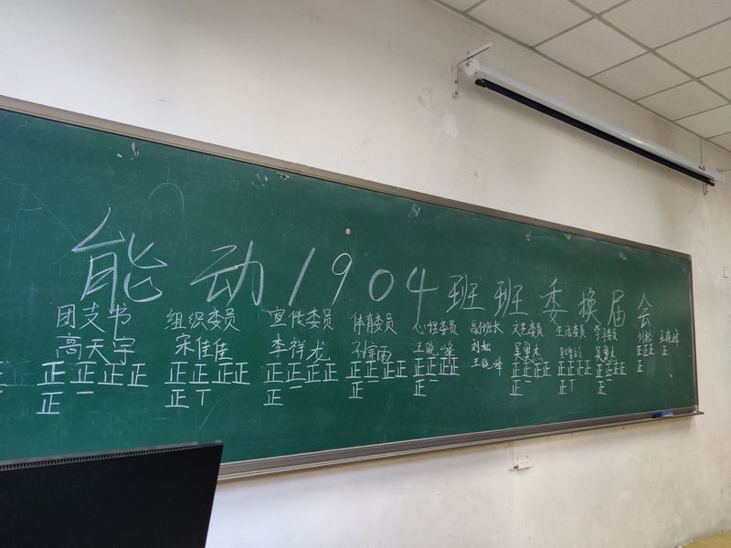 会议进行中,首先是上届的各位班委进行了大一学期的工作陈述,总结自己在去年任职期间的具体工作,并指出班级某些方面所存在的问题。随后进行了新班委的选举,由学生自己上台在自己想担任的职务后写下自己的姓名。若该职务只有一人竞选,则由其他学生匿名投票同意与否;若该职务有多人竞选,则需其他学生匿名选出自己认为的更合适的人选。在班长李寿坤的组织下,新班委很快确定下来。其中,团支书、班长、学习委员等多项职务均由新的学生担任。在本次换届活动中,班委成员发生了较大的变动,能动1904班级将以新的面貌迎接大二学期的生活。最后环节由辅导员徐光辉老师总结发言,徐光辉讲到:“秋天的落叶之所以美丽,是因为它经历了春的吐芽、夏的繁茂。我们如果想要实现未来的目标,取决于现在的行动。只有现在一点一滴的积累,未来才能有所成就。”