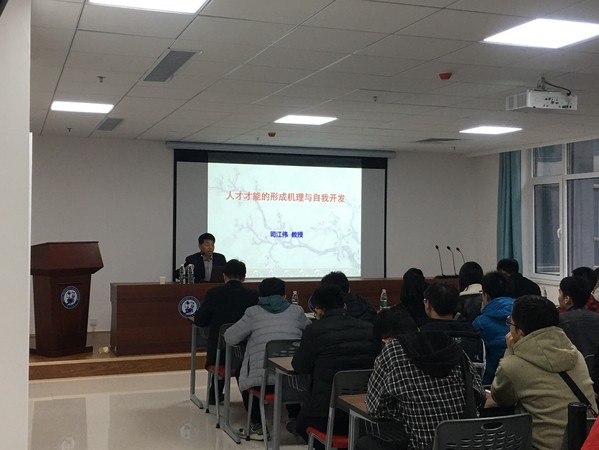 司江伟以三个问题为切入点:一是“何谓研究生?”,二是“何谓人才?”,三是“我们应当成为什么样的人才?”,为大家讲授了人才才能形成的机理,并结合自身生活经验为在座的研究生们分享自己关于如何成才的“才能三态”知识体系。他勉励各位要学生不断汲取知识,将得到的知识进行实践和运用,将所学到的知识进行量化并转化为业绩,最终得到知识和能力的物化结果。随后,他向现场听讲的学生们提出“比尔盖茨辍学却获得成功,这说明创新与高等教育无关吗?”的问题。现场同学主动分享自己的观点,司江伟对同学们的观点表示了肯定,并从学术角度对此进行了解答。最后,司江伟以自己总结的“五气体系”向大家介绍了关于才能的自我研发相关的知识,他表示人才要有志气、才气、人气、力气和运气。他指出“人活一口气”,并勉励各位研究生要有志气,要通过自身的努力,走向通往人才的道路,要以“养天地正气,法古今完人”为目标,并祝福在座的研究生能够“干大事”,“成大才”。