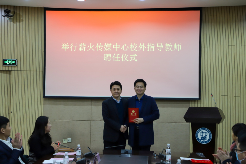 吴明铂为李明伟颁发聘书,聘任其担任薪火传媒中心校外指导教师。李明伟在随后的发言中表示了对学院的的感谢、对宣传工作的肯定,并提出在今后的工作中,定会为yl88858永利中国的新闻宣传建设和学生的发展等方面提供全力的支持、帮助和配合,为学院的发展贡献一份力量。