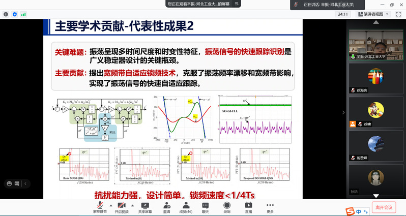 报告会上,辛教授首先分享了中国科协青年托举人才的申报经历以及自己的科研体会,介绍了3个方面的科研创新工作:振荡信号的快速跟踪识别;宽频带自适应锁频技术;有源阻尼控制技术。之后,辛教授从“个人努力”和“他人帮助”两个方面畅谈了研究生该如何规划自身的学术成长道路。最后辛教授就与会师生关心的话题进行了互动交流,现场气氛热烈。