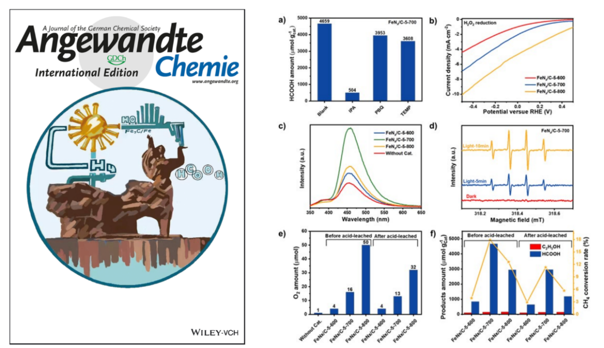 题为《Fe/Fe3C提升H2O2利用,实现甲烷转化抑制 O2生成》(Fe/Fe3C Boosts H2O2 Utilization for Methane Conversion Overwhelming O2 Generation)的成果发表在化学领域顶级期刊Angewandte Chemie International Edition上,并被选为封面文章,我校2018级硕士研究生邢毅成为第一作者,吴文婷教授和吴明铂教授为共同通讯作者。