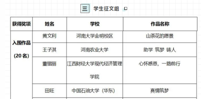近日,第七届“助学·筑梦·铸人”主题活动暨2020年“千校万岗·精准帮扶”就业专项服务行动公布评选结果,我院2020级电气工程及其自动化专业2004班学生田旺的文字作品《真情筑梦》获评入围作品。