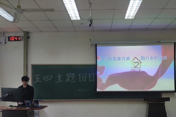 团会伊始,王彤辉将“五四青年节”与五四青年精神与青年志愿活动相联系,用生动的图片和具体的学校内青年志愿者代表和乡村助教活动向与会成员展现了发生在身边的“凝聚青春力量,助力乡村振兴”示例。接着,王彤辉为大家播放了一部摘自网络的视频,回顾了建国以来青年力量在社会基层建设中发挥的作用;青年人通过志愿助教、下乡扶贫等行动,切实助力乡村振兴,为全人民的广泛脱贫和全社会的进步贡献自己的力量,发挥着着越来越重要的作用。团会后期,与会成员共同开展了击鼓传花的游戏,选中的团员以此说出一段与脱贫或“青春力量”相关联的历史事实来增添活动的积极气氛并开展一定程度的知识普及,让与会成员有所感悟。会后王彤辉表示:”建国之初便有一批批十五六岁年纪的青年先驱为家国做出巨大贡献,现今作为大学生的我们更要努力效仿,为社会和国家发挥自己的每一份力!“