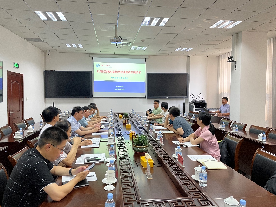 6月23日上午,团队一行首先来到胜利石油管理局有限公司电力分公司,胜利油田经营管理高级专家倪承波、电力分公司总经理刘玉林等油田领导、专家参加交流会。徐海亮副教授代表团队作了“以电能为核心的综合能源系统关键技术”的技术汇报,从研究背景、关键技术、研究成果等方面介绍了团队在综合能源系统领域的研究基础。双方围绕油田综合能源系统的建设和运营规划,进行了充分深入的技术探讨,特别是针对下一步油田综合能源系统建设面临的技术难题及后续合作模式进行了研讨。