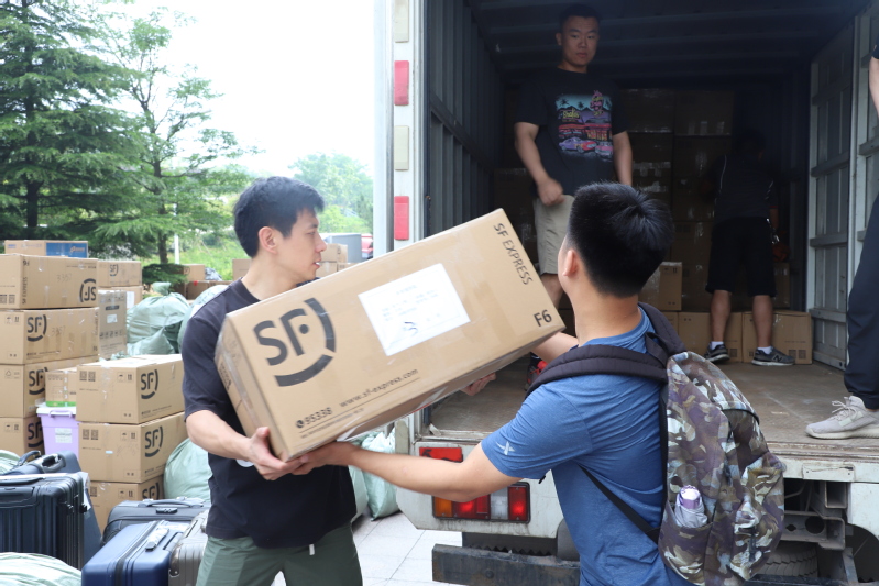 早8点,搬迁用货车及大巴车全部到位,学生包裹运到宿舍楼下固定区域后开始装车。行李全部装至货车后,学生分别坐上四辆大巴车,待全部就绪后一同发车。上午11点左右,全部车辆及人员到达古镇口校区,并进行卸车。