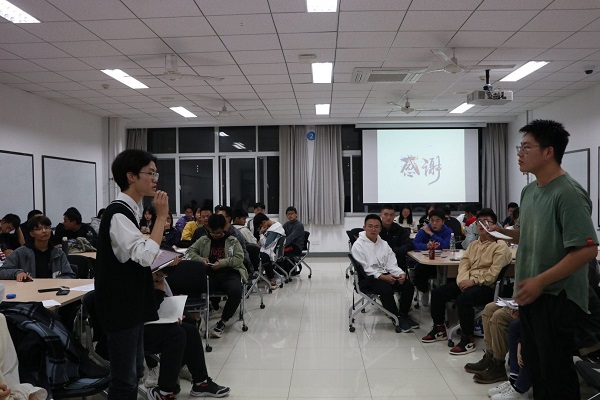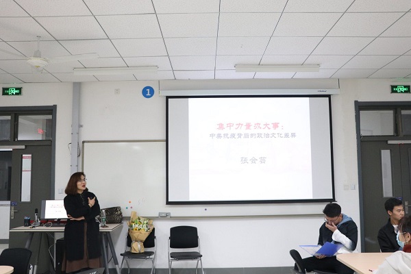 讲座伊始,吴尚泽介绍主讲人张会芸副教授。随后张会芸以戴口罩为切入点,展现中美抗疫的政治文化差异,她谈到:美国的特点是“上层不统一,基层不服从,民众不服从”,而中国是“核心决定政策,基层贯彻实施,国民万众一心”。她以视频和亲身经历为例生动形象地介绍出中美文化差异,通过对比展现出当代中国制度在疫情下的优势。讲座结束后,吴尚泽邀请在场学生举办了一场以“英雄造时势还是时势造英雄”为辩题的友谊辩论赛。来自过程装备与控制工程2101班以及能源与动力工程2102班的八位辩手就此辩题进行了一场激烈的辩论,两队据理力争,互不相让。活动结束后,来自能动 2103班的唐睿同学感慨说道:“张会芸老师的讲座让我们对中美政治文化差异有了进一步的认识,对党的制度更加自信。辩论赛中双方辩友的精彩发言,让我切身感受逻辑与脑力的碰撞。赛中选手优秀的语言也给我留下了深刻的印象,激励着我积极进行思考。”