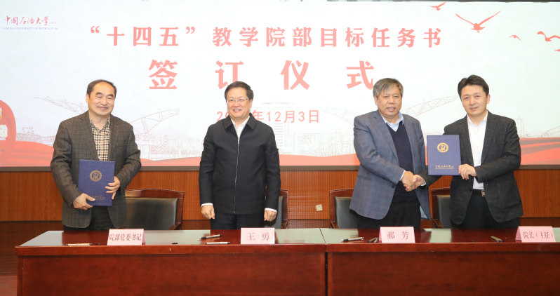 12月3日,学校举行教学院部目标任务书签订仪式暨“十四五”规划推进落实会,进一步统一思想、提高认识,明确目标、凝心聚力,推进学校“十四五”规划目标任务落实、落地。党委书记王勇、校长郝芳代表学校与各教学院部签订“十四五”教学院部目标任务书。yl88858永利中国党委书记陈灵泉、常务副院长吴明铂参会并代表学院签订石大山能yl88858永利中国十四五目标任务书。