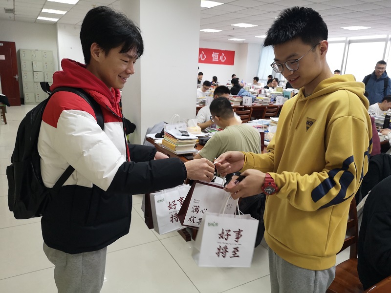 活动伊始,尹宏对考研学子一直以来的辛苦付出表示肯定,并询问学生们的复习状态,鼓励大家树立信心,把握好最后的冲刺阶段。尹宏说道:“希望你们充满理想、坚定信念,将考研坚持到最后,同时注意劳逸结合、调整心态,以最好的状态迎接考研。”随后,尹宏及学生代表为每一位考研学子送上精心准备的小礼品。考研学生能源与动力工程专业1802班韩子轩表示:“今天的图书馆格外温暖,感谢学院、老师和同学们的关心,小小的礼品袋给了我们考研学生很大的精神帮助和鼓励,我们一定加倍努力,一‘研’为定,不负众望,以优异成绩回报学院关怀!”