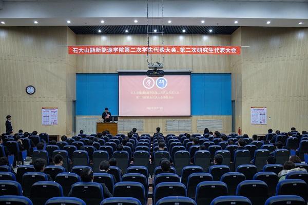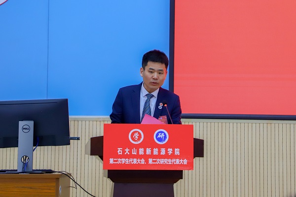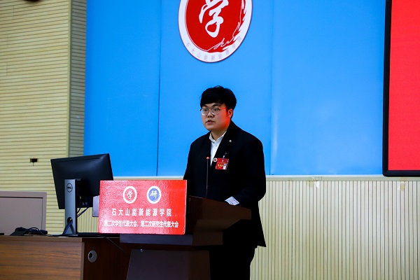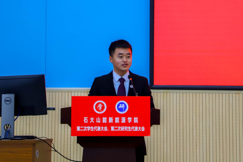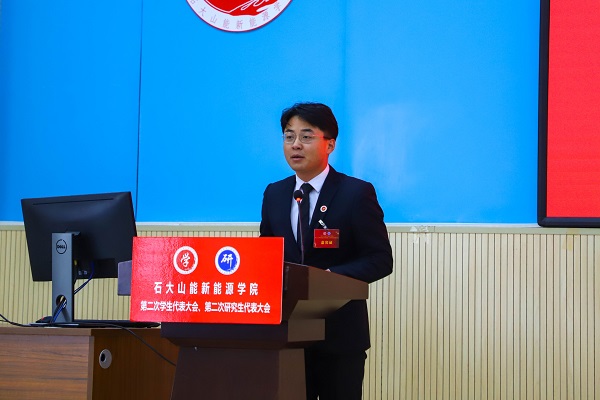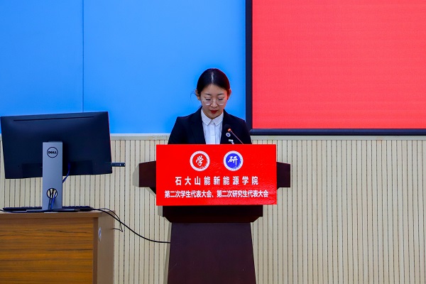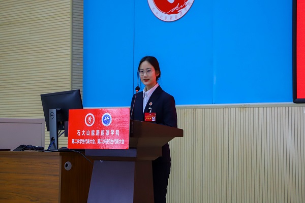 李玥嬛代表学院研究生会作题为《传承石大精神、勇担强国使命、为建设有更多能源学科特色的高水平研究型学院而奋斗》的工作报告。研究生会要始终把全心全意为广大同学服务,作为一切工作的出发点和落脚点。将继续努力维护研究生的权利,真正反映研究生呼声,代表研究生利益。从科研、文体、生活等方面入手,广泛听取研究生同学的意见,进一步优化服务的质量。努力做好权益维护工作,广泛开展反馈渠道,收集、反馈学生意见,为建设更美好的古镇口校区新家园不懈努力。