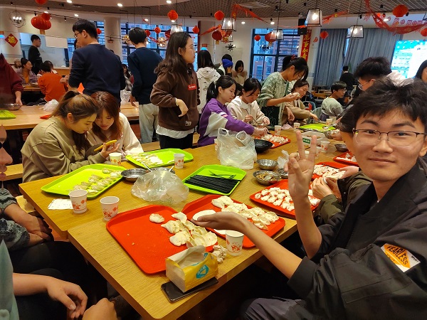 活动伊始,蔡森通和张馨冉安排全体学生按照小组就坐并分配包饺子的工具、食材等。他们向各组组长进行任务分配并向全体学生展示工具的正确使用方法,进行了安全教育。准备工作就绪后,包饺子活动正式开始。各组成员相互学习、相互帮助,来自不同地区的学生们交流自己家乡在冬至这一天的习俗,各位教师、辅导员也对全体学生的生活问题表达了关心。随着饺子的出锅,活动的气氛达到高潮,猪肉、牛肉、素三鲜三个不同口味的馅料满足了全体学生的口味需求,大家品尝着自己包的饺子,感受传统节日的氛围。班主任张秀霞表示:“同学们来自祖国的各个地方,既然相聚在这里,这里就是大家的第二个家,希望同学们互帮互助、共同成长。”