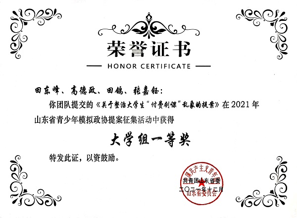 为更好地发挥共青团桥梁纽带作用,引导青少年了解并有序参与中国特色社会主义民主政治实践,共青团中央维护青少年权益部、中华全国学联秘书处共同开展2021年全国青少年模拟政协提案征集活动,受到社会各界广泛关注。此次活动,全国共有11.41万名青少年报名参加,山东省共有10525名青少年报名参加,收到具有针对性、操作性的高质量提案3857件。经省政协、团省委相关部门负责同志及相关领域省政协委员组建的专家评审团逐一评审,最终山东省共评选出大学组一等奖22件,青岛市有4件获评一等奖,其中我院1件作品获评一等奖,并经省级团委推荐、团中央初审、第一轮专家评审,已入围全国评审环节。