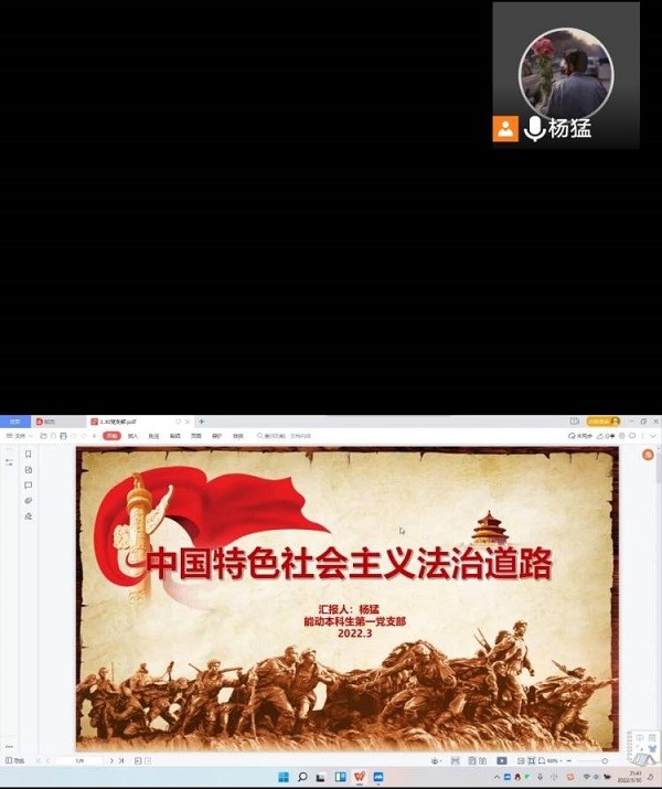 为坚定理想信念,提高党员的政治素质和思想水平,3月30日,我院能动本科生第一党支部开展线上组织生活,本次会议的主题是学习中国特色社会主义法治道路。会议由党支部书记曾伟主持,以线上腾讯会议的形式进行,支部全体党员参与。