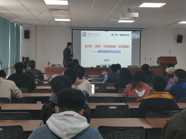 同时,学院新能源论坛推陈出新,电气工程系副教授徐海亮、储能科学与工程系特任副教授徐文刚结合自身经历,为同学们共上一堂“思政课”。徐海亮指出:“态度决定一切,要端正学习与工作的态度,在终身学习的过程中培养出创新精神,不断挑战自己,追求卓越。”