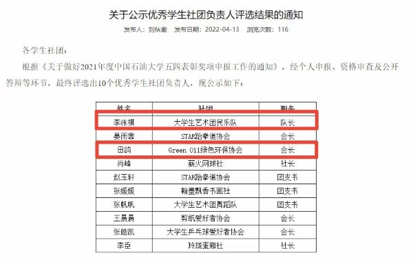 根据《关于做好2021年度中国石油大学五四表彰奖项申报工作的通知》,经个人申报、资格审查及公开答辩等环节,校团委社团管理部最终评选出十名优秀学生社团负责人,我院共有两名学生当选。