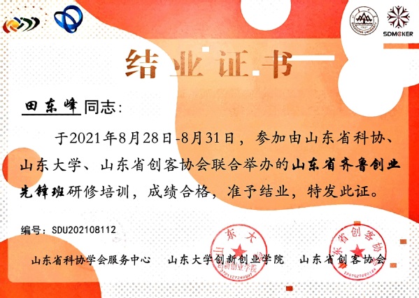 机会青睐于有准备的人,田东峰极强的创新能力很快就被“相中”。作为学校唯一学生入选山东省齐鲁创业先锋班并顺利结业,在聆听优秀企业家和年轻创业者分享的实战经验中点燃了他的创业激情与梦想。