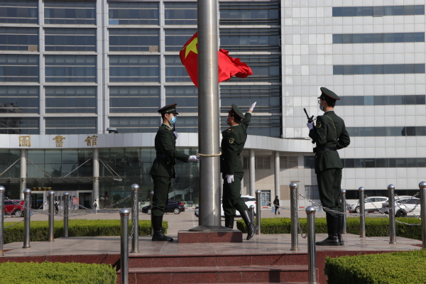 伴随着学院军乐队演奏的《义勇军进行曲》,国旗护卫队队员们扬起五星红旗,在全体师生的注视下,五星红旗冉冉升起。
