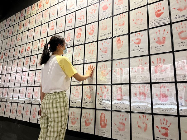 实践队队员们首先参观博物馆二层《南京保卫战》主题展厅,二楼展厅中陈列着保卫战中日双方序列、南京保卫战示意图、南京教导总队脸盆、薛宝宁相册、军队枪刺、殉难将士名录、南京大屠杀期间报纸、照片等历史文化展品;随后进入博物馆三层参观《老兵口述史资料》展厅,三楼展厅中主要有抗战实物藏品、抗战资料,实践队队长在博物馆讲解员的带领下将手与南京抗日老兵手印相触。队员们通过视频会议进行线上学习,实践队队员辛雨恬带领大家观看南京民间抗战博物馆微博发送的抗战中的“军人魂”佩剑,“南京保卫战”殉难将士,一个南京市民的家国情怀等讲解视频;吴烁为大家讲解了爱国将领冯玉祥先生写的对联“要想着收复失地,别忘了还我河山”是馆长吴先斌先生在京参加嘉德春拍所得,异常珍贵;涂佳丽向大家推荐了南京民间抗日战争博物馆馆长吴先斌先生的一段访谈《吴先斌:守护抗战精神的民间记忆》;最后李阳旸总结道“历史的真相不容遗忘,更不容被抹杀,新一代青年要铭记这段血淋淋的历史,明白和平的来之不易,更应该继承传扬先烈不惧牺牲、众志成城的奋战精神,牢记使命、履行责任、践行初心、维护民族尊严、为实现中华民族伟大复兴奉献自己的力量。”
