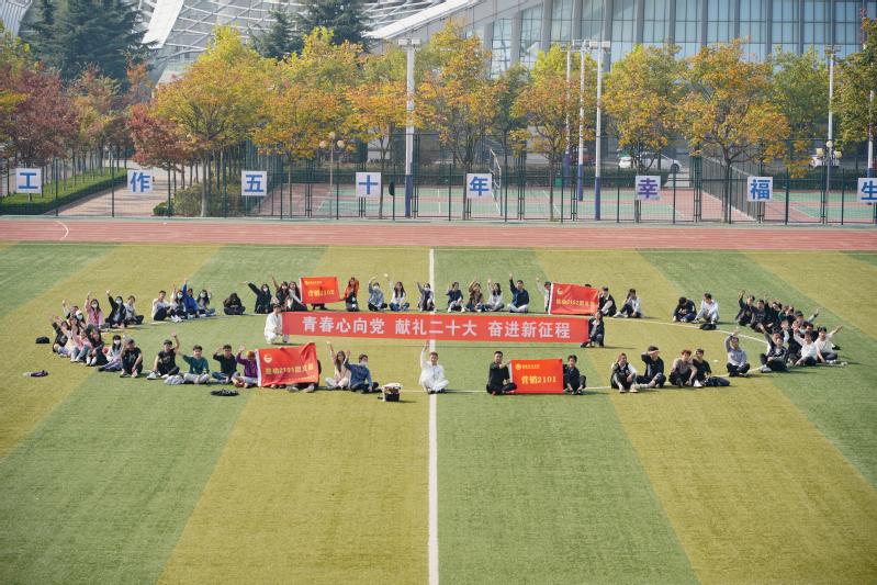 活动伊始,各班团支书组织学生积极观看党的二十大开幕式,引导广大共青团员感受过去五年中国发展的不寻常、不平凡,并坚决拥护共产党,为我们国家更辉煌的明天而奋斗。在观看结尾,营销2101团支书马晓荟提出:我们要做有理想、敢担当、能吃苦、肯奋斗的新时代好青年,特别是在疫情防控的特殊时期努力发挥应有的作用。随后,学生来到了操场,进行有趣的“大风吹”游戏环节,在游戏中大家集中注意力,提高反应能力。通过游戏,四个班的学生迅速破冰,团结在一起共同摆出“二十大”字样的图案,在二十大之际向党献出一份特殊的礼物。最后,学生在阳光下,一齐挥手,表达对党的二十大顺利召开的喜悦与祝贺,更是对未来新征程的决心和期待。