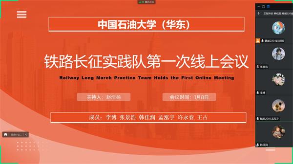 为进一步确认实践总体目标,明确队内成员分工,规划阶段性任务,1月8日,我院“铁路长征”实践队开展第一次线上会议,会议由储能科学与工程2201班赵浩扬主持,实践队全体成员参与。