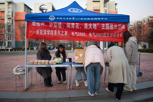 在为期一周的准备工作中,青年之家成员与支部成员相互配合、紧密联系,共同做好活动策划、人员安排、奖品制作以及场地申请等基本工作,以保证当天团日活动正常开展。活动于荟萃广场西侧如期举行,马艳雨向在场学生进行植树节相关知识的宣传,她从植树节的节日起源、节日活动以及节日意义等方面做详细介绍。随后,杨子钰引导在场学生参与植物种植实践体验,并通过开展知识问答或植树节相关留言等方式换取花卉种子,“每一次播种都是深耕的开篇,每一棵幼苗都是未来的希望”。此次活动累计发送130余包花卉种子,包含波斯菊、洋桔梗、风铃草等绿植。