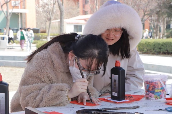本次活动的摊位不仅陈列了精美的书法、篆刻、国画作品,供学生欣赏学习,还提供了笔墨纸砚,鼓励学生积极参与、自由练习。活动伊始,志愿者以“正楷”为例,耐心指导参与者分别进行软笔书法与硬笔写作,鼓励学生挥出笔墨,大胆书写。翰墨飘香书画社成员王欣雨表示,指导教学与亲身实践二合一,有助于帮助参与者获得更好的书法体验,同时这也是一个教学相长,共同进步的过程。随着参与人数的增多,志愿者倡议大家在春联和彩纸上写下诗词美句,寄托对新一年的期许,并在白板上展示出每位参与者的书法成果。参与者赵彩岩表示:“这次书法体验让我在自主创作的同时切身感受到了书法的乐趣,希望以后还能参与相关活动”。