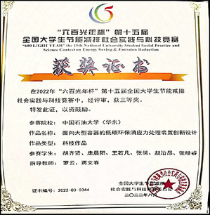 第十五届全国大学生节能减排社会实践与科技竞赛全国三等奖