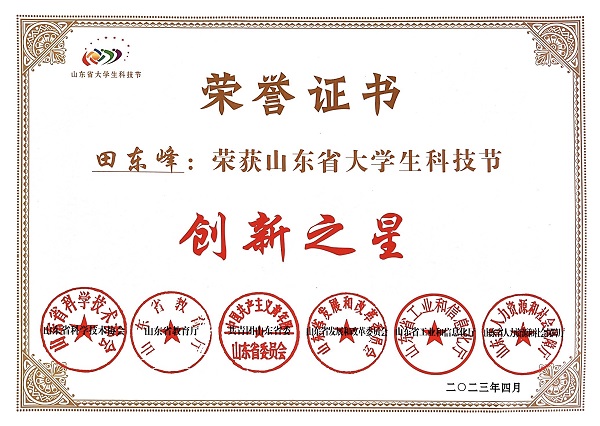 近日,山东省科学技术协会下发了《关于公布山东省大学生科技节突出贡献奖、山东省大学生科技节“双创之星”的通知》,我院环保设备工程专业1901班田东峰获评山东省大学生科技节“创新之星”荣誉称号。