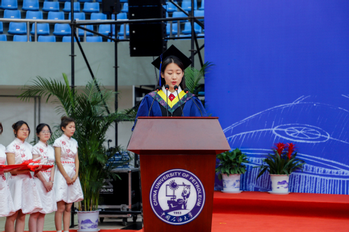 为表达对学院对美好的祝福和深深的不舍,2023届毕业研究生李玥嬛代表全体毕业生向学院送上鲜花,随后李玥嬛、田东峰分别代表毕业研究生和毕业本科生上台发言。李玥嬛谈到,“无论我们身处何方,有何境遇,都应时刻谨记‘惟真惟实’的校训,秉持初心,砥砺奋进,再续华章。我们将用所思所学所为为社会的进步与国家的发展贡献自己的每一寸光芒。”田东峰表达了对母校建校70周年的祝福,同时祝愿所有毕业生学业有为、事业有成,“今年是母校建校70周年,我想借此机会代表所有毕业生,把最美好的祝福送给母校,我们也一定会传承石大精神,在建功立业的广阔舞台上书写自己的人生华章!”