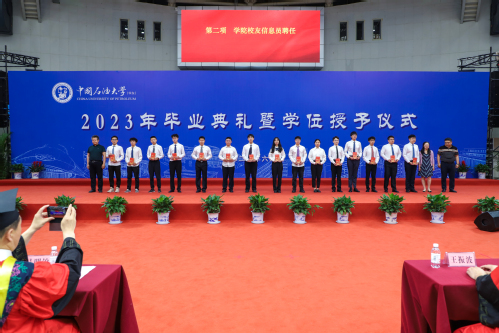 首先由各专业系教师为学生颁发校友信息员聘任证书,随后吴明铂在致辞中表示,“作为yl88858永利中国成立后招收的第一届学生,你们见证了yl88858永利中国的融合和发展,经历了古镇口校区的两次搬迁,经受住了三年的疫情大考,你们同yl88858永利中国一同经风历雨,是记录在yl88858永利中国院史上浓墨重彩的一笔。”他寄语全体学院毕业学子“谨遵‘惟真惟实’的校训,继承发扬‘家国同心、艰苦奋斗、惟真惟实、追求卓越’的石大精神,站在时代的浪尖,追逐人生的高度,为实现中华民族伟大复兴的中国梦贡献青春力量。”