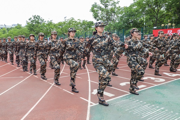 五营全体成员于学生宿舍十号楼下集结完毕后正式开始进行训练。五营军训第一天的训练任务包括站军姿、跨立、稍息、停止间转法以及踏步走等基本动作。其中以站军姿为主,军姿是军训的第一项训练任务,是进行一切训练任务的基础,各连教官亲身示范,详细讲解挺胸收腹、双肩打开、手臂夹紧、正视前方等动作要领,并对学生不规范的动作进行纠正。为提高受训学生士气,丰富军训生活,五营各连教官鼓励学生唱军歌、展才艺,学生踊跃上台表演,为大家带来《强军战歌》《假如今天战争爆发》等军歌,在愉悦的氛围中加深学生们对于军歌的印象,活跃了各连队的气氛,为受训学生对的军训生活增添了一抹色彩。