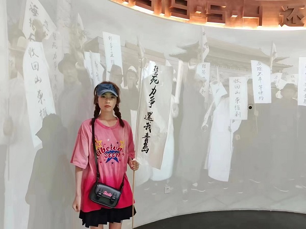 青岛一战遗址博物馆是目前国内唯一全面展现一战对中国命运影响的博物馆,也是诠释和记录第一次世界大战与中国最丰富、最全面的专题博物馆。实践队队员首先来到博物馆门口,其整体造型宛如“和平鸽”,“鸽子”头部还有“和平钟”,入口上空还有飞翔的和平鸽,“誓死力争,还我青岛”格外显眼。接着,实践队队员进入大厅后,梁令臻向队员们介绍到:“该博物馆以‘还我青岛’为主题,分为‘德占青岛’‘日德战争’‘苦难归程’三个展厅,在参观历史遗址的过程中,希望我们能够结合当下,思考新时代青年的责任和使命。”随后,实践队在梁令臻的带领下依次参观了各个展厅,展厅运用了大量珍贵文物、档案资料以及场景复原、多媒体等现代化布展方式,再现了自青岛建置至主权回归的艰难历程。在博物馆的出口处,设有便利贴留言板,大多为研学的青少年所留,实践队队员们也执笔写下了自己的所思所想。最后,实践队队员牟薪羽说道:“历史无法改变,但未来可以创造。我们应当勿忘国耻,永不忘却青岛昨天经历的磨难;奋发图强,托起中华民族伟大复兴的梦想。”