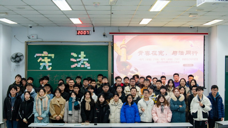 为进一步提升团员法律意识,建全法治思想,2023年12月24日晚上7:00于西环204,电气(卓越)2106团支部联合电气(卓越)2107团支部和本研石工2101团支部于西环204举办“青春在宪,与法同行”主题团日活动。本次活动由电气2106团支部团支书郝杰担任主持,并邀请了学校宪法宣讲团成员张末进行宪法宣讲。