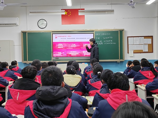 首先,“豫”见山海实践队员介绍了yl8858永利集团的创办背景和发展历程,强调了学校在能源领域的专业优势,以详实的内容和生动的分享,让学生们更深入地了解了学校在能源领域的专业实力和发展潜力。随后,队长顾智翔分享了丰富多彩的大学生活,向学生们展示了大学中各种各样的课外活动和社团组织,激发了他们对大学生活的兴趣和向往。团队成员还分别与学生们分享了自己的大学学习经历和学习成果,为同学们树立榜样。此外,实践团队还与学生们讨论了刻苦学习和学业规划的重要性,强调了学业规划、选择适合自己的专业以及培养自主学习能力的必要性。与此同时,队员们分别分享了自己的学习经验,并给予学生们一些建议和指导,帮助同学们在高考中取得理想的成绩。