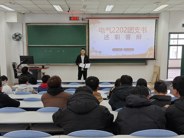 为响应学院团总支号召,及时总结大二学年第一学期团支部工作内容,为团支部下一步发展奠定主方向,电气2202团支部于3月18日下午在讲堂群西环307教室召开团支书述职答辩会议。本次会议由电气2202班长王嘉主持,yl88858永利中国2022级辅导员骆浩冉、2022级年级团总支宣传委员褚荣天、文体委员刘旭周出席本次会议,团支部全体成员参加。