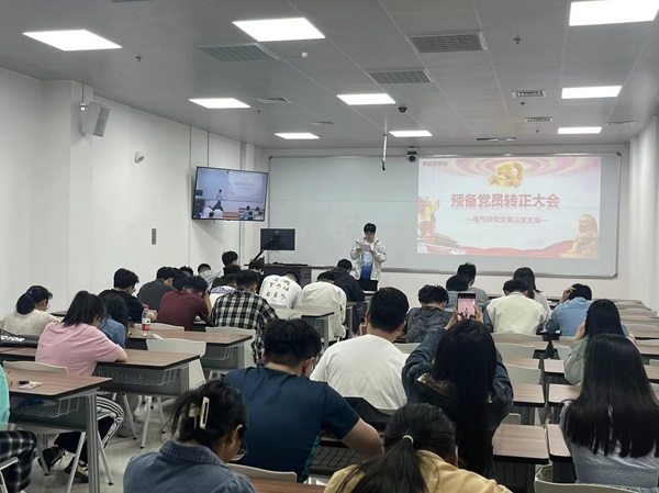 6月7日下午,电气研究生第三党支部在古镇口校区文体中心B73教室隆重召开预备党员转正大会。本次会议重点讨论了预备党员陈翔宇、张鹏同志的转正事宜,会议由党支部副书记杨宇航主持,支部党员积极参与。